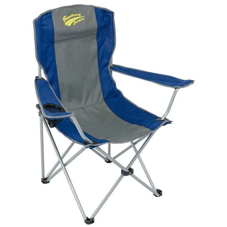 Breakaway with this great value Quad Fold Everyday camping chair. Strong powder coated 17mm steel frame. Cover of 600D PVC coated fabric complements the strong steel frame. Convenient Drink holder located in the arm of the chair.